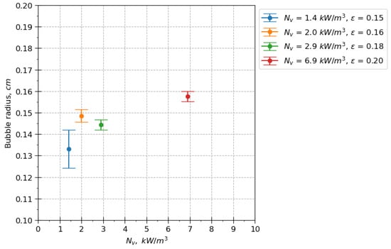 Graph of the dependence of the average bubble radius on the specific input power for different modes of operation of the mass transfer unit (see Table 1).