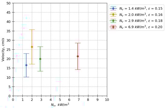 Graph of the dependence of the average bubble velocity on the specific input power for different modes of operation of the mass transfer unit (see Table 1).