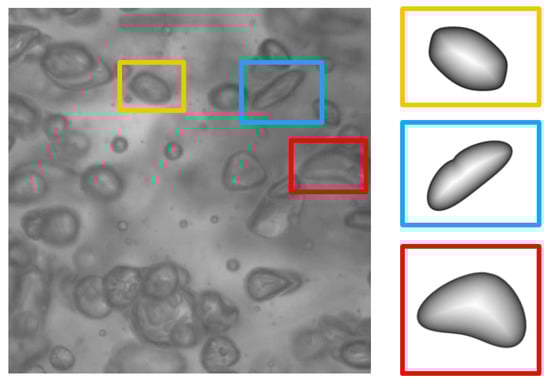 An example of the diversity of gas–liquid inclusion shapes during physical absorption (left) and their corresponding artificial images (right), generated using the superellipse boundary formula from [].