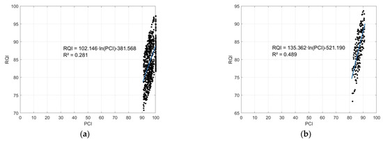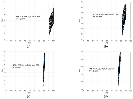The results of the correlation analysis in Table 4 and Table 5 show that for asphalt and concrete pavement, the coefficient of significance for each group of sample data is less than 0.05, and Pearson’s correlation coefficient is greater than 0, which indicates that PCI is significantly and positively correlated with RQI.
