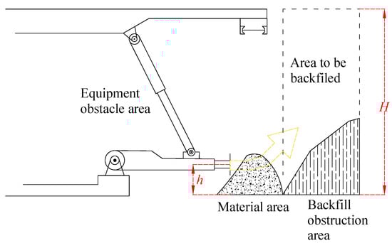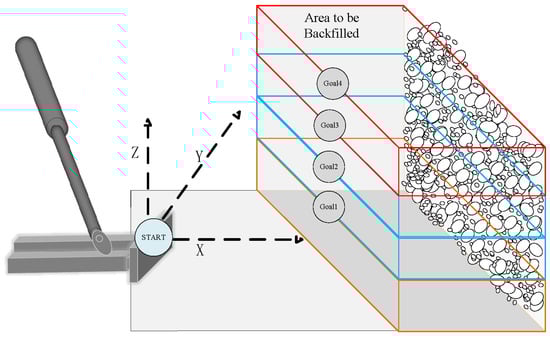 The considerable depth at which China’s coal resources lie necessitates their extraction through shaft mining, as extensively discussed in recent research [,]. However, the traditional mining techniques employed in this process have led to ground subsidence, ecological damage, and insufficient coal capacity release, as supported by previous studies [,,]. To address these issues, the concepts of green mines and smart mines have gained prominence, leading to increased recognition and adoption of solid backfilling technology. This innovative approach is crucial for maintaining the stability of mining area rock structures, as emphasized in studies []. By employing solid backfilling technology, mining safety can be ensured, and issues encountered in the extraction of pressure coal and other resources under buildings, railroads, and bodies of water—the “three under” problem—can be alleviated, as previously discussed []. Furthermore, this technology plays a vital role in mitigating the issue of coal gangue accumulation, as highlighted in research [], and has been extensively implemented to address these complex challenges []. The underground coal mine backfilling space is a complex mixed area, comprising filling equipment, filling material transportation equipment, bulk material, and a completed filling body. Controlling the filling effect is aimed at achieving a certain degree of compactness of the filling material in the hollow area after stabilization, managing the amount of roof subsidence, regulating ground deformation within the required range, and monitoring tamping force in real-time to ensure compliance with design requirements []. Accordingly, the solid backfilling push-pressure mechanism is pivotal in the coal mine solid backfilling work, as it governs the molding force of the filling material. The task of filling involves controlling the push-pressure mechanism to transport the filling material to the designated area and execute the push-pressure tamping process. Furthermore, path planning of the coal mine solid backfilling pushing mechanism refers to forecasting the optimal action path of the filling support’s pushing mechanism to deliver the filling material to the designated area within the hollow space.