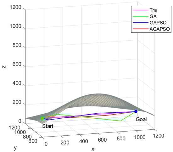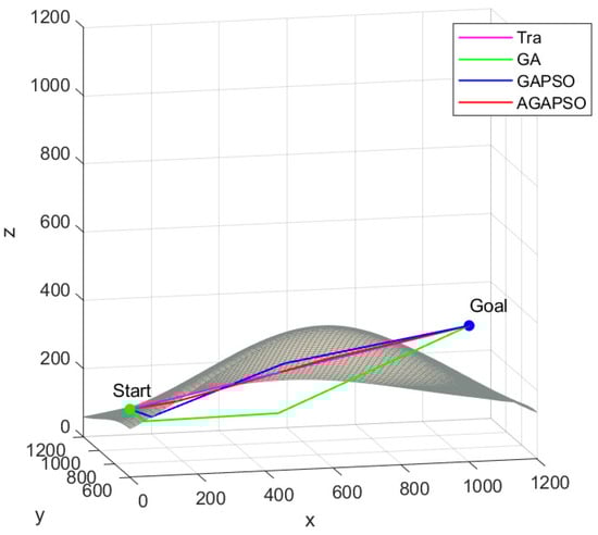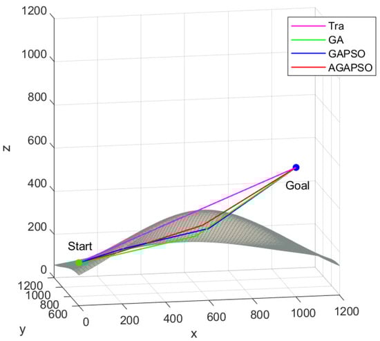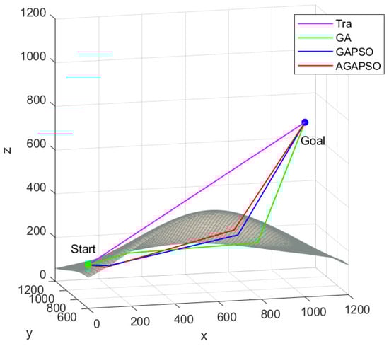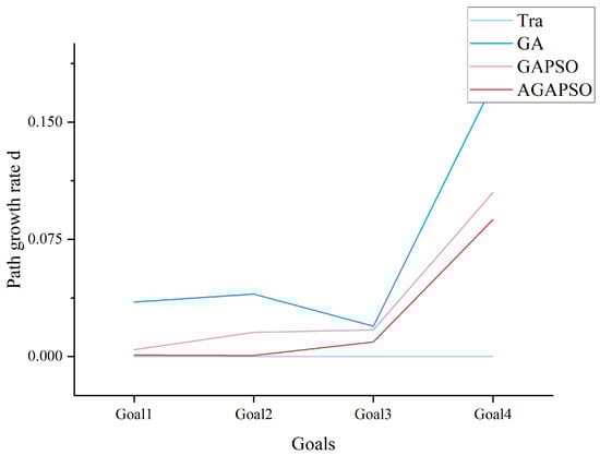 As shown in Figure 10, a comparison of the GA and GAPSO algorithms demonstrates that the AGAPSO algorithm calculates the smallest path growth rate d for both, indicating that it adheres most closely to the shortest path.