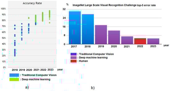Increase in neural network prediction accuracy: (a) accuracy rate and (b) top-5 error rate in the ILSVRC.