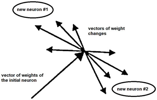 Figure 4 shows the vector of weights of the hidden layer neuron at some training step and the vectors of weight changes corresponding to individual training examples. The change vectors have two preferential directions and form a region in space that is significantly different from the spherical one. The essence of the algorithm is to identify and split such neurons. As a result of splitting, there are two neurons instead of the one initial neuron in the network. The first of these neurons has a vector of weights, which is the sum of the vector of weights of the original neuron, and vectors of changes in the weights of one of the preferential directions. The summation of the vectors of weight changes in the other preferential direction and the vector of weights of the original neuron results in the synaptic weights of the second new neuron [].