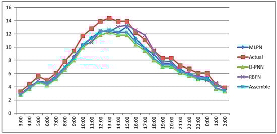 Let us determine how the models work for different seasons. For this purpose, we enter data for 5 years and compare the obtained data with real values for different periods (0:00–23:00 on 1 January 2022, 0:00–23:00 on 1 April 2022, 0:00–23:00 on 1 July 2022, and 0:00–23:00 on 1 October 2022). Figure 5 shows the predicted air temperature values obtained by each method and the grouping method for 1 January 2022.