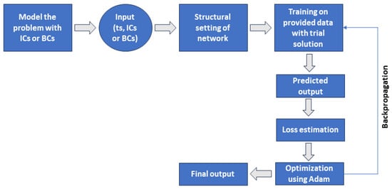 NeuroDiffEq is a Python package constructed utilizing PyTorch, which employs ANNs to tackle both ordinary and partial differential equations (ODEs and PDEs). NeuroDiffEq streamlines problem-solving by emphasizing the problem domain for defining differential equations and initial/boundary conditions. It also provides flexibility for users to explore solution strategies, including ANN architecture and training parameters. NeuroDiffEq is not limited to a fixed architecture, but is designed to be versatile, allowing users to construct various types of neural network architectures. In our approach, a Fully Connected Neural Network (FCNN) [], the most basic type of DNN [], is leveraged as an approximating tool for dependent variables. An FCNN is structured in such a way that all neurons in a layer are fully connected to all neurons in the subsequent layer. This architecture allows information to flow through the network without skipping any neurons, making it a straightforward and densely interconnected structure. This network in the FCNN does not have any restrictions on connections between neurons in different layers, allowing for a comprehensive information flow throughout the network. Utilizing NeuroDiffEq to assess the mathematical models of dynamical systems outlined in Section 3.1 and Section 3.2, we carried out various experiments. The working rule for NeuroDiffEq is that once the network is fed with the input values, the NNs are trained to learn the underlying patterns in the data generated by the differential equations by using a trial solution which takes care of initial or boundary conditions as well. The differential equation is formulated as an optimization problem which is to be minimized. The trial solution is fed into the residual of the differential equation which is then minimized as much as possible to attain the approximated solution of the differential equation. We split our experiments into distinct instances based on the varying values of the parameters used in Equations (3) and (9). Our methodology elucidates the process of approximating solutions to DEs through the utilization of an FCNN in a more comprehensive manner, as illustrated in the flowchart in Figure 1 below.