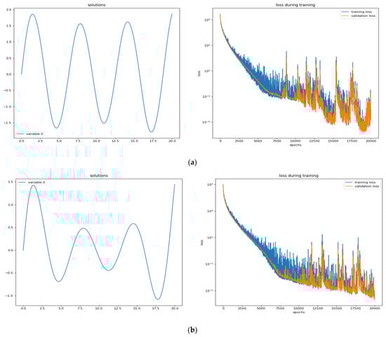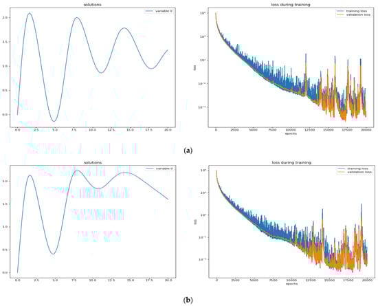 The training and validation losses for both cases are displayed in Figure 3 to give insight into the model’s performance during the learning process. A comparison between the DNN-based scheme and a numerically approximated solution using LSODA is presented in Figure 4a,b. It is obvious from the figures that there is a high degree of agreement between the approximations made by the DNN and those obtained by LSODA, which guarantees the exactness and accuracy of the proposed methodology.