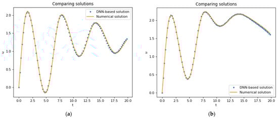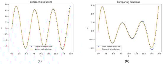 We conducted a comparative analysis between the oscillatory behavior generated by the solution of Equation (1) using a DNN-based approach and the results acquired by the implementation of the LSODA algorithm []. Our experimental setting comprises two major cases: parametric excitation in the absence of external excitation and parametric excitation in the presence of external excitation.