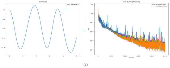 (a) DNN-based approximation of the solution of Equation (1) for case 1, when , and loss during learning process. (b) DNN-based approximation of the solution of Equation (1) for case 2, when , and loss during learning process.