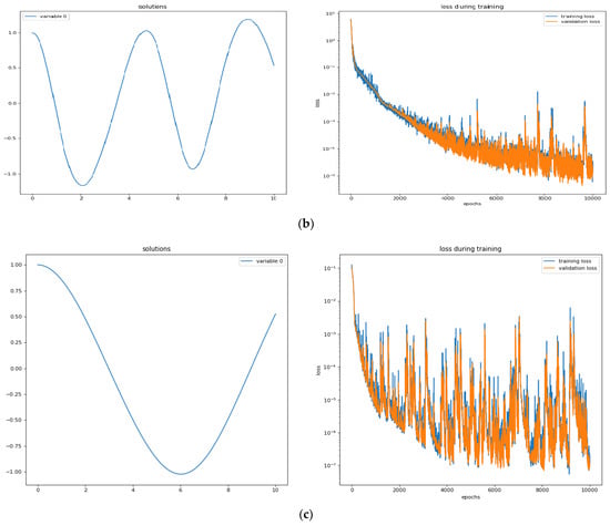 The rhythmic behavior of oscillations is examined in Figure 7a–c for a range of parameter values. The training and validation losses are shown in the figures above for each time up to 10,000 epochs. By changing the network’s weights during the training process, this loss can be reduced; optimization methods are useful in this context. A comparison between the DNN-based approach and the numerical method is shown in Figure 8a–c.