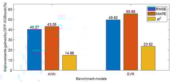 Table 4 summarizes the prediction outcomes of DFP-XGBoost and other benchmark models in terms of all performance measurement metrics. It is observable that the proposed method has achieved the best results with an RMSE of 5.270, an MAPE of 6.740%, and an R2 of 0.942. The ANN is the second-best method, with an RMSE of 8.823, an MAPE of 11.836%, and an R2 of 0.820. The result of SVR (RMSE = 10.461, MAPE = 15.212%, and an R2 of 0.763) is inferior to that of DFP-XGBoost and the ANN. To quantify the correlation between the actual and estimated results, the R2 index can be used. This index is also an indicator of the proportion of the variation in the CS of HPC that can be estimated from DFP-XGBoost and its influencing variables. With an R2 of 0.94, the prediction results are satisfactory because the hybrid model is capable of explaining 94% of the variation in the output variable. Moreover, the ANN and SVR are only capable of explaining 82% and 76% of the variation in the modeled variable. Figure 3 graphically shows the improvements in results obtained by DFP-XGBoost. The newly developed method helps decrease roughly 40% and 43% of the prediction errors in terms of RMSE and MAPE, respectively. In terms of R2, DFP-XGBoost achieves a 14.88% improvement compared with other methods.