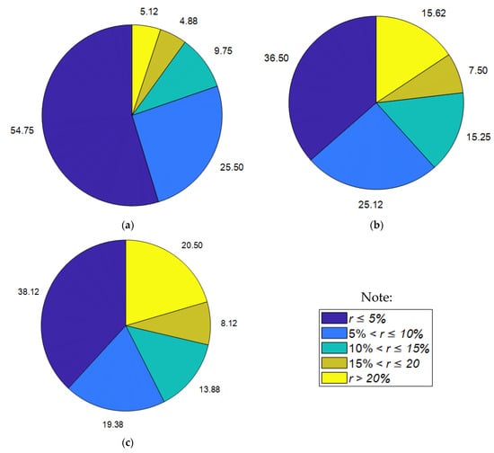 In addition, Figure 4 provides more insights regarding the distribution of the residual range (r) of the prediction models. It is noted that the range of residuals has been normalized by the magnitude of the actual CS values. Herein, the values of r obtained from each model are divided into five categories: (i) r ≤ 5%, (ii) 5% < r ≤ 10%, (iii) 10% < r ≤ 15%, (iv) 15% < r ≤ 20%, and (v) r > 20%. As pointed out in [], a relative error of less than 20% can be considered satisfactory for the task of CS estimation. Meanwhile, the relative error less than 10% indicates excellent prediction outcomes. Moreover, comparing the distribution of prediction errors can bring about better understanding of the predictive capability of the machine learning model [].