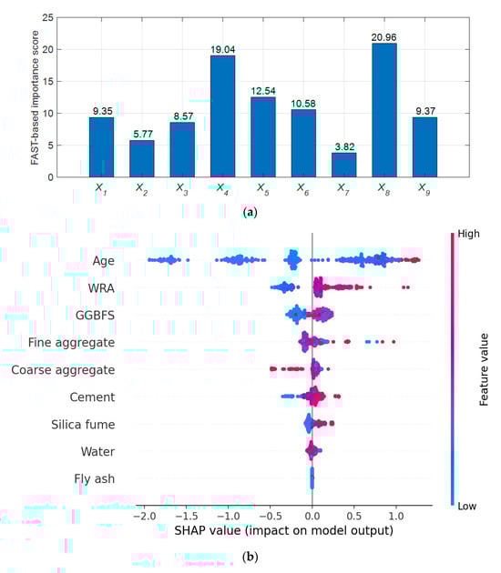 The outcome of the analyses is presented in Figure 6. Based on FAST, four out of nine variables have significant effects on the CS of HPC, namely X8 (quantity of WRA), X4 (quantity of GGBFS), X5 (quantity of fine aggregate), and X6 (quantity of coarse aggregate). Concrete age (X9), cement content (X1), and silica fume (X3) demonstrate moderate impacts on the response. Meanwhile, the relative importance of fly ash content and water content is lower than other variables. Based on SHAP, we are able to categorize the features into three groups according to their order of importance. The first group includes the curing age, quantity of WRA, quantity of GGBFS, and quantity of fine aggregate. The dosages of coarse aggregate, cement, and silica fume can be categorized into the second group. Meanwhile, the third group consists of water content and fly ash content. Thus, the results of SHAP are, to some degree, in agreement with those of FAST. Both methods emphasize the importance of the WRA in HPC mix design.