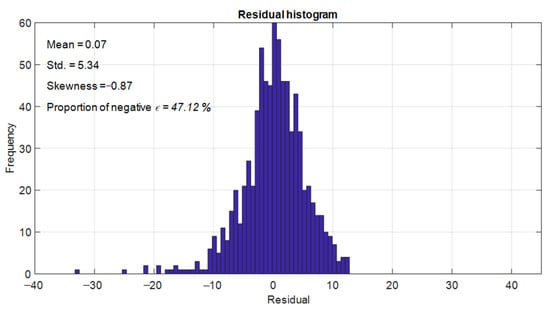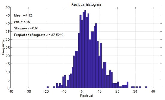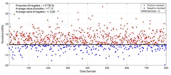 Using the ASEL with = 10, the performance of DFP-XGBoost regarding the characteristics of its residuals is significantly improved. As shown in Figure 11, the average value of the residuals increases from roughly 0.7 to 4.12. The bulk of the distribution shifts to the right side of the horizontal axis. Therefore, the number of overestimations is considerably reduced from 47.12% to 27.5%. In other words, underestimations account for 72.5% of the prediction. The skewness of the distribution also changes sign; this fact indicates that its right tale is longer than the left one. It is highly desirable for CS estimation because the magnitude of overestimation has been reduced. However, the use of the ASEL also causes a certain increase in the range of positive residuals. As demonstrated in Figure 12, the average range of positive residuals increases from 3.80 MPa to 7.12 MPa. On the contrary, the average range of negative ones decreases from 4.13 MPa to 3.80 MPa.