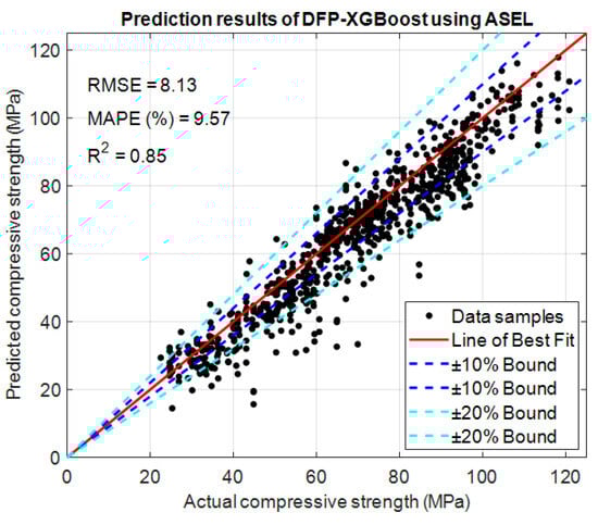 The prediction results of DFP-XGBoost trained by the ASEL (denoted as DFP-XGBoost-ASEL) are demonstrated in Figure 13. As observed in the figure, the majority of the data points are located below the line of best fit. This fact accounts for the high proportion of underestimations. DFP-XGBoost-ASEL is able to achieve an RMSE of 8.13, an MAPE of 9.57%, and an R2 of 0.852. Notably, the MAPE of the model is still less than 10%, which indicates good prediction performance in CS estimation []. Detailed performance of the models using the two loss functions are provided in Table 5. Based on the experimental results, the use of the ASEL brings about a reduction in the model’s performance in both the training and testing phases. The Wilcoxon signed-rank test yields a p-value of 0.00009 < 0.05, confirming that the overall predictive accuracy of DFP-XGBoost-ASEL is statistically lower than that of the one using the SEL. Nevertheless, the former also helps significantly restrict the occurrence of overestimations. Therefore, there is an inevitable trade-off between overestimation reduction and prediction error minimization.
