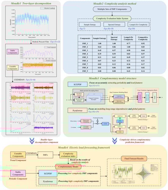 - A component complexity analysis method based on bi-layer decomposition is proposed. A Hodrick Prescott Filter (HP Filter) is applied to extract the long-term trend and short-term fluctuation characteristics from the electricity load data. Complete Ensemble Empirical Mode Decomposition with Adaptive Noise (CEEMDAN) is applied to decompose the short-term fluctuation components. A subsequence complexity evaluation index system is constructed based on the sample entropy, spectral entropy, and Lempel–Ziv complexity, providing a comprehensive characterization of the complexity features of each IMF component.