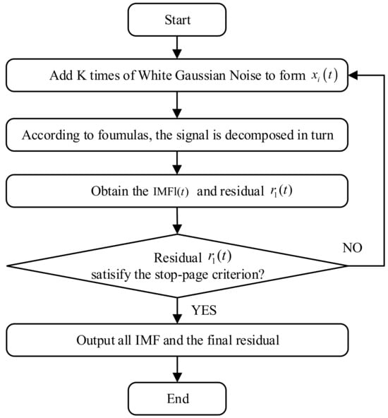 Complete Ensemble Empirical Mode Decomposition with Adaptive Noise (CEEMDAN) is an improvement of the CEEMD method, and its flowchart is shown in Figure 2. The noise intensity is determined by using adaptive white noise and calculating the signal-to-noise ratio of each scale, thereby improving the accuracy and stability of the decomposition. The specific implementation steps of CEEMDAN are as follows: