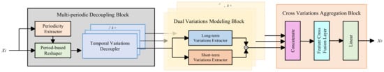 - An improved model, SCEPDF, based on the multi-periodic decoupling block [], is proposed. The Cross-Variation Aggregation Block is introduced to improve the PDF. During the fusion of periodic features from the dual-variant modeling block, interaction terms between different periodic features are generated element by element through a feature-crossing mechanism. This approach deeply explores the nonlinear relationships between periodic features and significantly improves the model’s forecasting accuracy under single-channel input.