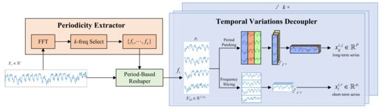 The Multi-Periodic Decoupling Block uses Periodicity Extractor and a Period-based Reshaper to convert 1D time series into 2D space, and its structure is shown in Figure 4. For a given one-dimensional input with dimension d, the Periodicity Extractor is used to analyze the time series in frequency domain, and then, the Period-based Reshaper is used to reshape the one-dimensional input into a two-dimensional tensor. The specific expression is as follows: