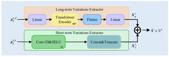 As shown in Figure 5, the Dual Variation Modeling Block consists of a long-term variation extractor and a short-term variation extractor. The long-term variation extractor for patch with long-term information is initially projected into the potential space by linear projection, and it is then processed by multiple Transformer encoder layers. But the short-term variation extractor contains a sequence of convolution blocks, each consisting of a Conv1d layer and a nonlinear activation function. These blocks are sequentially structured to gradually expand the receptive field, accommodating periods of various lengths.