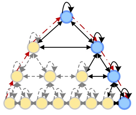 As shown in Figure 7, the time dependence of the observation time series is described in a multi-resolution manner, which is mainly composed of the following two parts: inter-scale connection and intra-scale connection. Specifically, let denote the lth node under scale s, where denotes the scale from bottom to top. Each node in the graph can focus on a set of neighbor nodes on three scales as follows: adjacent A nodes on the same scale, including the node itself (denoted as ); its C child nodes in the C-ary tree (denoted as ); and its parent node in the C-ary tree (denoted as ), expressed as follows: