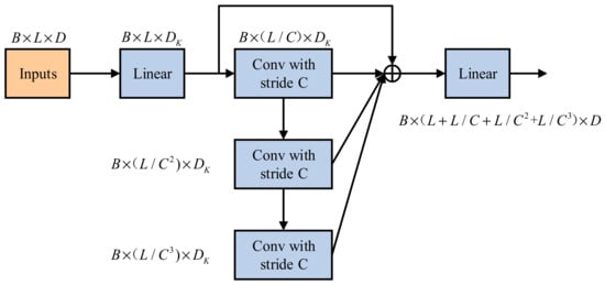 As shown in Figure 8, the CSCM applies multiple convolution layers with a kernel size of C and a step size of C to the embedded sequence in the time dimension, and it obtains a sequence with a scale of s and a length of . Based on the obtained sequences at different scales, a C-ary tree is formed. In order to reduce the amount of parameters and calculation, before inputting the sequence into the stacked convolution layer, the dimension of each node is reduced by the fully connected layer, and it is restored after all convolutions, which significantly reduces the number of parameters in the module and prevents overfitting.