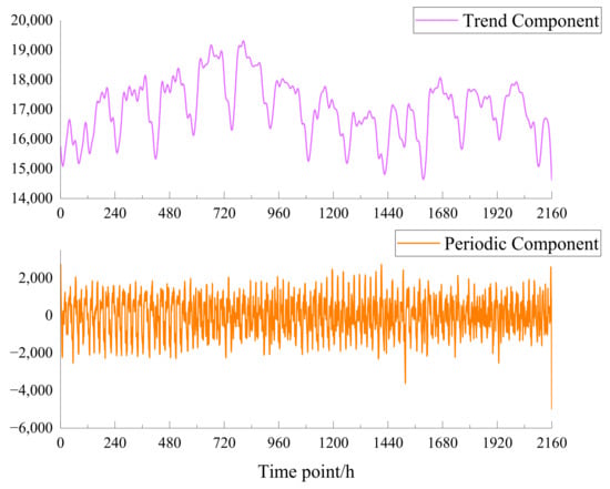 This paper utilizes HP filtering to extract the trend and cyclic components of the data. As shown in Figure 9, the trend component changes smoothly, reflecting the long-term evolutionary trend of the electrical load, whereas the cyclic component exhibits larger fluctuations, effectively capturing the short-term fluctuation characteristics of the electrical load. This decomposition method allows for a more intuitive revelation of the electric load’s variation characteristics across different time scales.