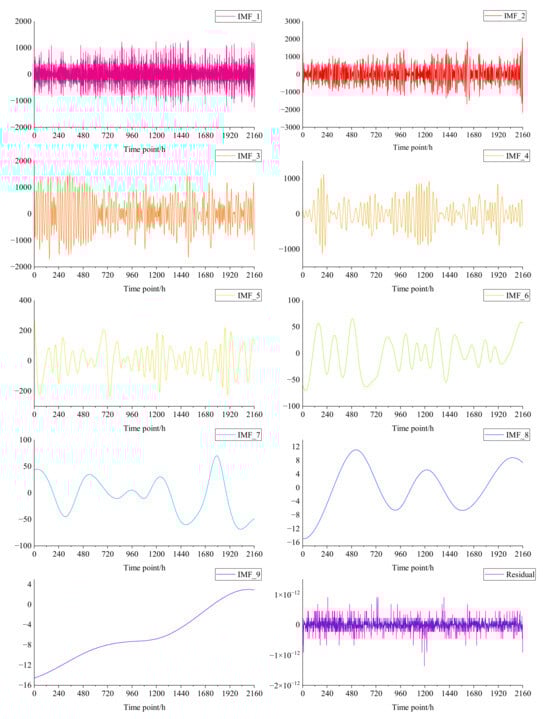 Considering the instability of the periodic component, this paper uses CEEMDAN to decompose it twice. By introducing white noise, CEEMDAN effectively suppresses the mode mixing problem in the traditional EMD method, thus making the decomposition result more stable. It can be seen from Figure 10 that the IMF component obtained after the second decomposition is more stable than the original periodic component, and this can comprehensively reveal the multi-band characteristics of the electrical load. At the same time, because the order of magnitude of the residual component is much smaller than that of other IMF components, the residual component is ignored in this paper.