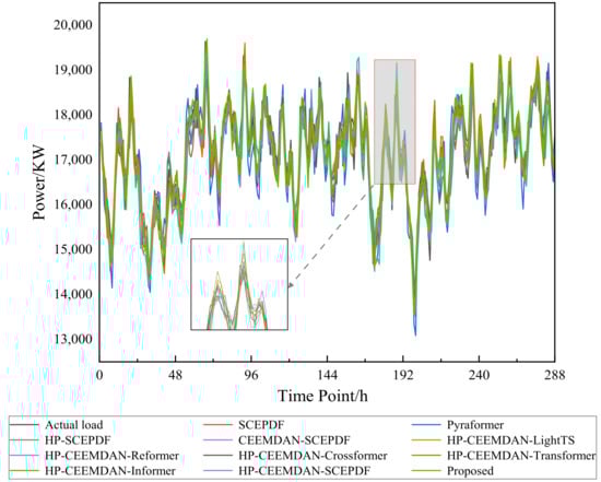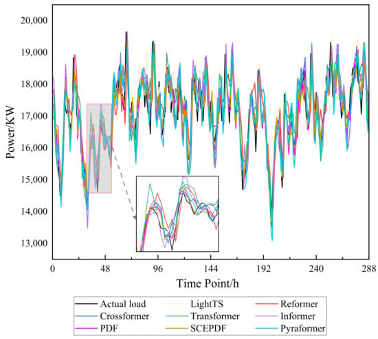 - A complementary forecasting model based on SCEPDF and Pyraformer [] is constructed. SCEPDF is used to accurately extract the periodic and local characteristics of components with medium and low complexity. Pyraformer is utilized to efficiently model the long-range dependencies and global patterns in high complexity components. Experimental results verify that the integration of these two models’ complementary characteristics allows for a more comprehensive capture of the multi-level features in the data, thereby significantly improving the accuracy of short-term electricity load forecasting.
