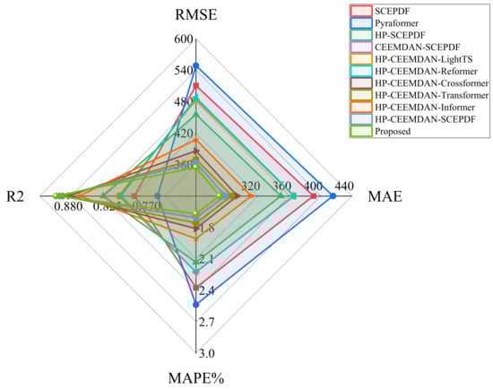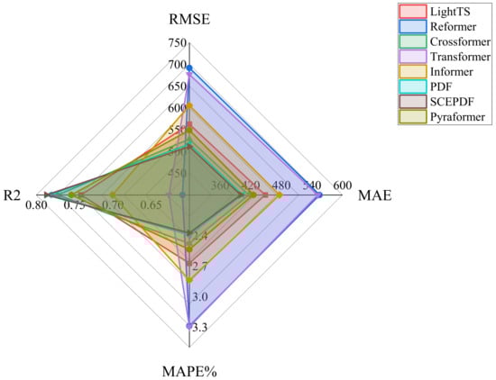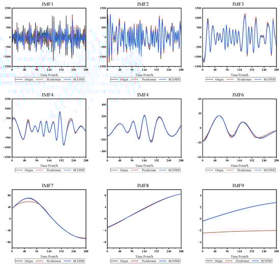 In this paper, the PDF model is improved by introducing the Cross-Variation Aggregation Block, as shown in Equations (14)–(17). When the Cross-Variation Aggregation Block fuses the periodic features from the Dual Variation Modeling Blocks (DVMBs), the interaction terms between different periodic features are generated element by element, through the feature crossover mechanism, so as to deeply explore the nonlinear relationship between periodic features. However, as shown in Equations (11)–(13), the advantages of SCEPDF are mainly reflected in the extraction of local features and periodic patterns. When dealing with high-complexity components, the ability to capture long-term dependencies and global patterns is limited. In contrast, Pyraformer performs cross-scale modeling of complex time series through pyramidal attention mechanism and multi-resolution tree structure. As shown in Equations (18) and (19), the pyramidal attention mechanism limits the attention range of each node to its neighborhood, including adjacent nodes at the same scale, child nodes, and father nodes. It effectively captures local information and long-range dependencies at different scales, thereby efficiently modeling global patterns.