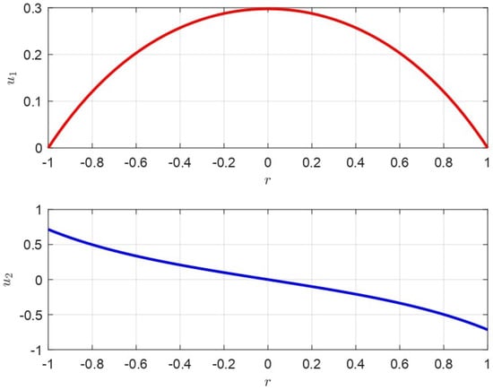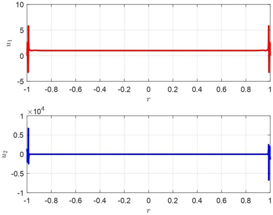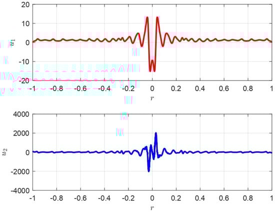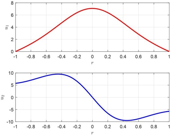 The two-point BVP under study (20) is singular with respect to the independent variable at the initial point , due to the division by zero of the first term on the right-hand side of (20). We must deal with the singularity in the coefficient at because the bvp4c solver always evaluates the ODEs at the endpoints. For this problem, we show how providing the correct value at the singular point is enough for computing the numerical solution. By the theoretical results presented in the previous sections, a smooth solution is expected. Indeed, symmetry implies that this smooth solution has a derivative that vanishes at the origin . This physical condition allows for demonstrating that