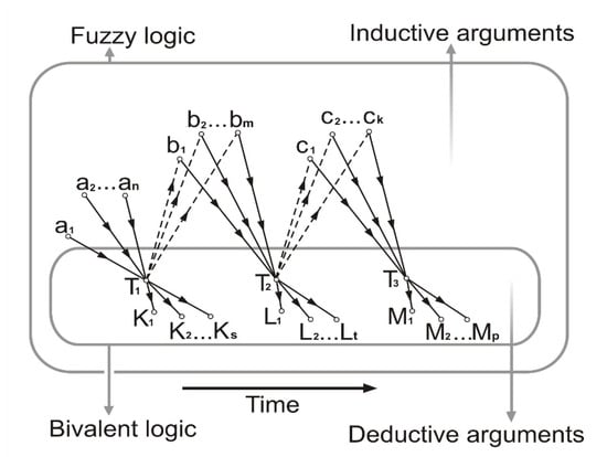 This process is graphically represented on the left side of Figure 4, where α1, α2, α3, α4, … are observations of the real world that have been transformed, by induction, to the theory T1. Theory T1 was verified by deduction and additional deductive inferences K1, K2, …, Ks, …, Kn were obtained. Next, a new series of observations b1, b2, b3, …, follow. If some of those observations are not compatible to the laws of theory T1, a new theory T2 is formed by induction (intuitively) to replace/extend T1. The deductive verification of T2 is based on axioms partially or even completely different to those of theory T1 and new deductive inferences L1, L2, …, Ls, …, Lm follow. The same process could be repeated (observations c1, c2, c3, …, theory T3, inferences M1, M2, …, Ms, …, Mk, etc.) one or more times. In each case the new theory extends or rejects the previous one approaching more and more the absolute truth.