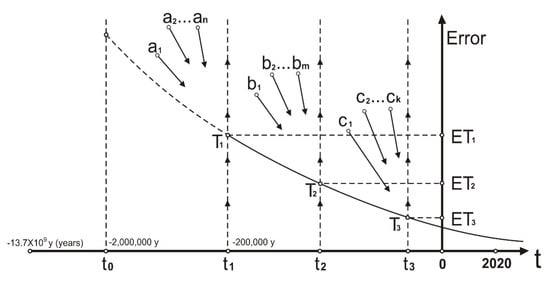 All those discussed in this Section are depicted in Figure 5, representing the curve of the scientific error. This curve, which is connected to the scientific method illustrated in Figure 4, represents the scientific progress through the centuries (the smaller the error, the greater the progress). The horizontal axis in Figure 5 corresponds to the time (t) and the vertical one to the value of the scientific error (E). The starting point M of the curve, giving the maximal value of the scientific error, corresponds to the time t0 of occurrence of the homo erectus on the earth. The curve is decreasing asymptotically to the axis of time approaching continuously the absolute truth, where the value of the scientific error is zero. The part MT1 of the curve has been designed with dots, because no evidence of deductive reasoning existed before, which means that only empirical but not scientific progress was realized during that period. The point T1 of the curve corresponds to the time t1 of occurrence of the homo sapiens, while the value of −13.7 × 109 years is approximately the time of creation of the Universe (Big Bang) [].