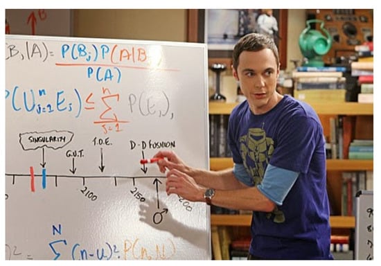 Equation (2), connects P(I/H) with the conditional probability P(H/I) of the inverse process. The final outcome depends on the value of the independent probability P(H) about the truth of the existing hypothesis, usually referred as the prior probability. The Bayes formula, although at first glance looks as a salient generalization of the original concept of probability, has been proved to be very important for scientific reasoning. Many philosophers assert that science as a whole could be viewed as a Bayesian process! (e.g., see [,], etc.) The New York Times reports that “Bayesian statistics are rippling through everything from physics to cancer research, ecology to psychology”; see also Figure 7, retrieved from []. Artificial Intelligence specialists utilize Bayesian software for helping machines to recognize patterns and make decisions. In a conference held at the New York University on November 2014 with title “Are Brains Bayesian?”, specialists from all around the world had the opportunity to discuss how the human mind employs Bayesian algorithms to pre-check and decide.