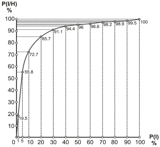 Further, the first and the third example enable one to study the sensitivity of the solution of the corresponding problem, which is expressed by the value of the conditional probability P(I/H). It becomes evident that the variable which affects dramatically the solution is the value of the independent probability P(I) of a subject to be a carrier of the virus. Figure 8 represents graphically the changes of the problem’s solution P(I/H) with respect to the changes of the value of P(I).