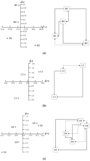 Regarding the construct “technology development”, it can be understood from Table 9 and Figure 3c. About centrality (d + r), D2′s value had the greatest influence. In the causality (d − r) part, the three indicators D2, D4, and D5′s value were positive, indicating that these were cause indicators, and D5 was the strongest one. Contrarily, the two indicators D1 and D3 were negative in value which means these were effect indicators, and D1 had the largest negative value. Grounded on the causal relationship’s analysis of centrality and causality, D5 was the strongest influence criterion, and the most affected criterion was D1. With the purpose to enhance the technology development capability, the DP Company must apply D5 as the deciding criterion, and as the primary criterion for enhancing the technology development capability.