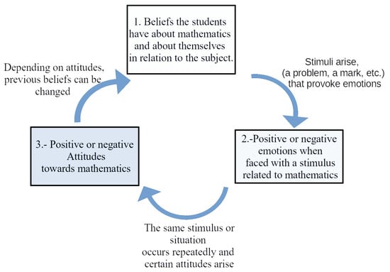 The affective domain is defined as a set of feelings, moods and states of mind, understood as something other than pure cognition, and among which three specific elements stand out: attitudes, beliefs and emotions [,]. In [,] it is explained that these factors interact in a cyclical way, in the way we perceive mathematics, as we can see in Figure 1.
