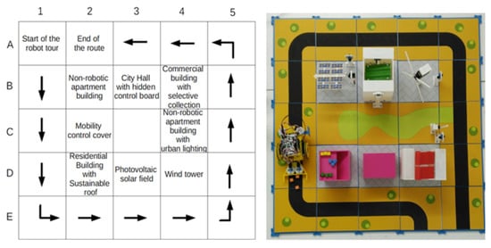 The main limitation for the use of STEAM projects in compulsory education is their absence in the national curricula. For that reason, these type of projects are usually part of extracurricular activities and are not integrated into the normal functioning of the classroom. In our previous works [,,], the curricula of 4th, 5th and 6th grade of Primary Education in Spain, in particular in the Valencian Community were analyzed to determine the areas of opportunity for STEAM learning projects. From the 11 detected opportunity areas, the opportunity area “Sustainability” was selected in [], for the development of the STEAM project called “Sustainable City”. The board in Figure 2 reproduces the block of a city that must be organized so that when the robot travels around its perimeter street, the different elements that make it a sustainable city are activated.