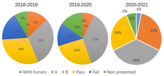As we can see, the distribution pattern of grades, as well as the percentages in the control groups, years 2018–2019 and 2019–2020, are similar, 17% vs. 15% of fail grades, 30% vs. 26% of pass grades 31% vs. 37% of B grades. However, the pattern changes significantly in the experimental group, in the academic year 2020–2021, we can see that the percentage of A grades has increased significantly, reaching 29%, and there is a 3% of grades with honours and finally, the percentage of fail grades has disappeared, reaching 0%.