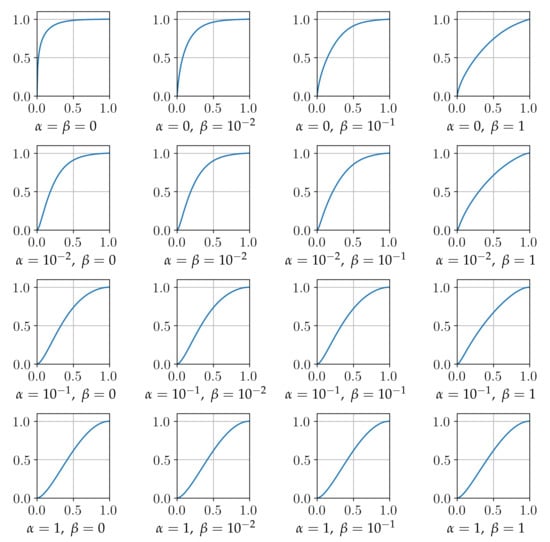 Here is electric permittivity of the undamaged medium, is the so-called interpolation (or degradation) function, and is a parameter which prevents degeneracy of (9) at . The role of f is the interpolation of the medium properties between the damaged and undamaged phases, see [,,].