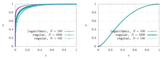 In this series of calculations, a mesh convergence is checked for the problem considered in [] (Figure 3, left plot), which corresponds to here, and for the corrected one, introduced in the current work, with , (Figure 3, right plot).