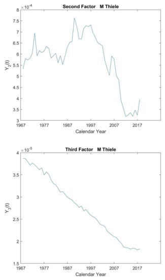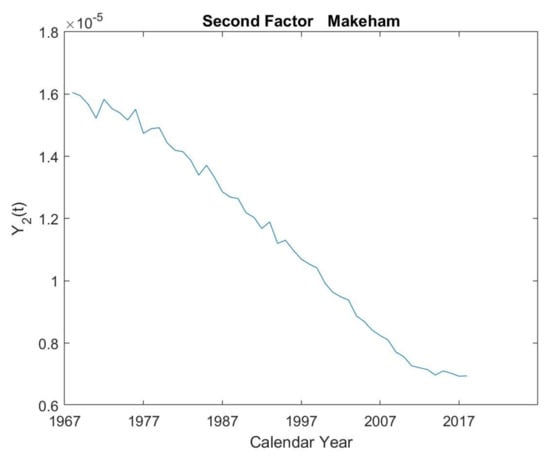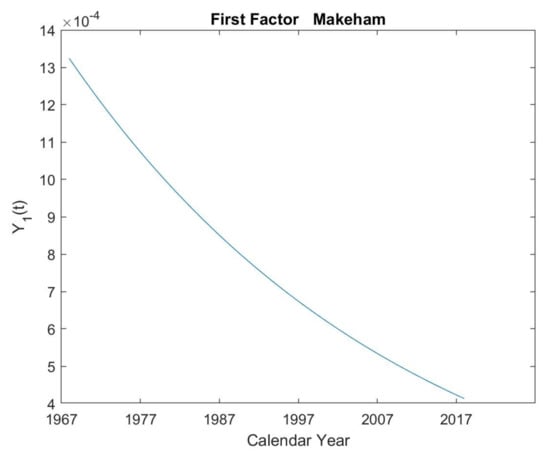 The factors have a constantly decreasing trend in time, apart from the second factor, which decreases over the last 15 calendar years only as depicted by Figure 3  (see Table 1). The first and the third factors decline very fast until the 2000s, to depict the extraordinary improvements in infant mortality and mortality at older ages. As for the Makeham’s law case, the factors are still way above their long-term averages  and thus we expect further improvements of mortality in the long-run. Such long-term averages are very important for long-run projections of mortality rates. In unreported estimations, we test the changes of the values of these parameters to slight changes in the estimation time window, finding reasonable stability.