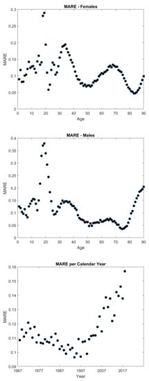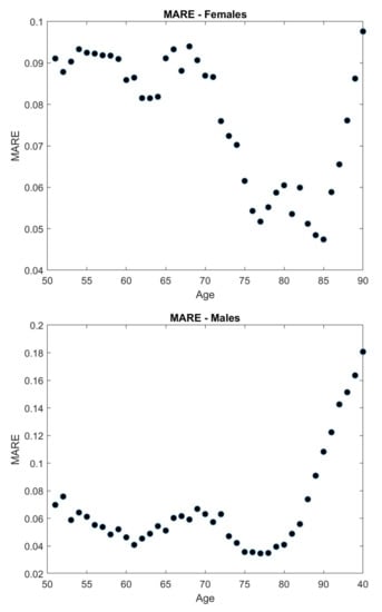 The figures plot the values of the MARE for female and male ages and averaged over calendar years.