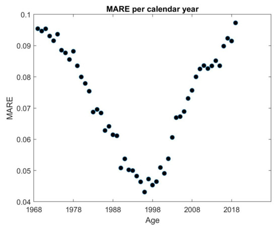 The figure plots the values of the MARE for the ages of female and male participants and averaged over calendar years.