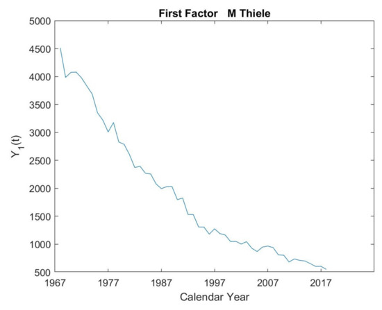 Indeed, the modified Kalman filter approximates the state-process transition density to a Gaussian density with the same conditional first two moments and introduces a non-linearity through the non-negativity constraint. The resulting quasi-maximum likelihood is then maximized. In implementing the Kalman filter recursion, we adopt a sequential formulation (see [,]) which allows us to avoid matrix inversion. Indeed, we could have followed Monte Carlo approaches as in []. In particular, particle filtering was used in [] in the context of interest rate modeling with CIR-type models. However, given the dimensionality of our problem, which includes several factors, a large number of observations and parameters to estimate, we preferred to apply Quasi-Maximum Likelihood methods, which turned out to be less computationally intensive. Our approach is justified in light of the evidence provided by several works [,,] regarding the accuracy of the method for affine interest rate term-structure models.