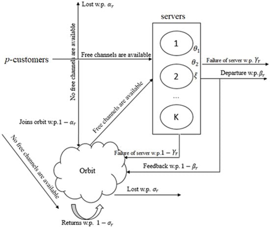 After the completion of the service process, the customer either leaves the system forever w.p. or goes to the orbit for repeated service w.p. provided that there are r customers in the orbit,