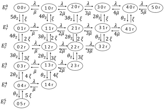 Let us fix the value of and first consider determining transition intensities between the states within a subset (level), . In order to be short, a transition from state to state with intensity is denoted by Let the initial state be . As a result of analyzing possible transitions, we have the following relations: