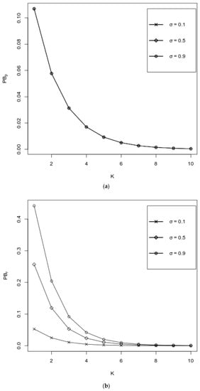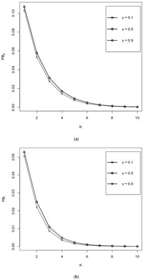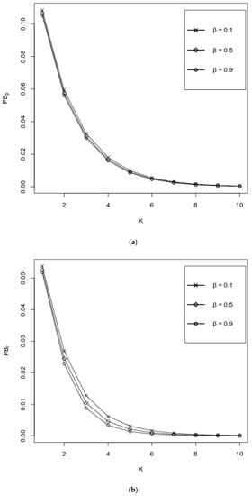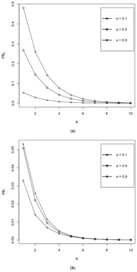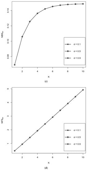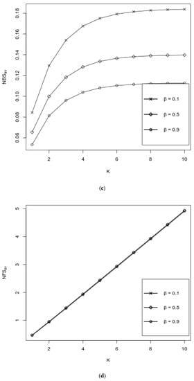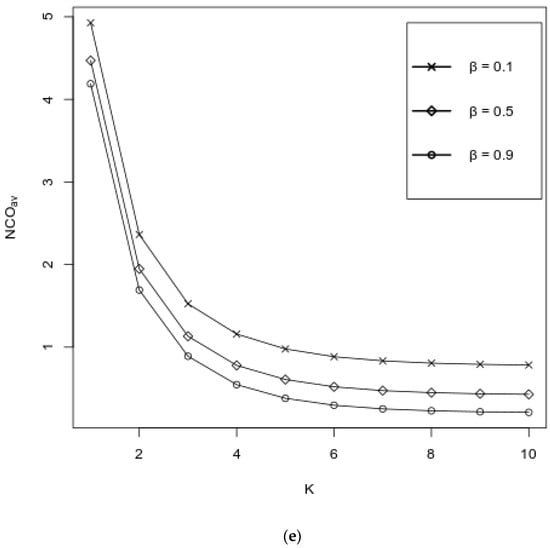 Figure 3a–e represent the behavior of performance measures as functions of K over various values of , where values of other probabilities are fixed as follows: . It can be observed from Figure 3a,b that both and decrease with respect to K, where an increase of is favorable for , whereas increases with respect to ; for large values of K, i.e., when K ≥ 7, the impact of the values of is negligible. It is seen from Figure 3c,d that both the and the increase, and their values are almost independent of . Figure 3e exhibits the impact of K and over the . It is seen from the graph that the values of the decrease with respect to both K and . As in Figure 3a,b, here, when K ≥ 7, the impact of the values of on the values of the is negligible.