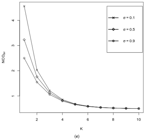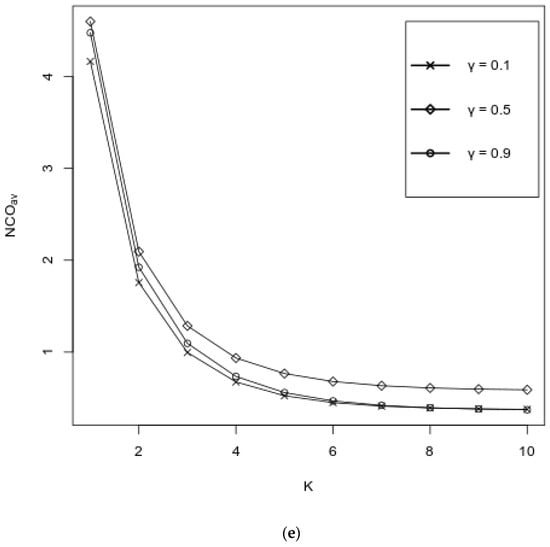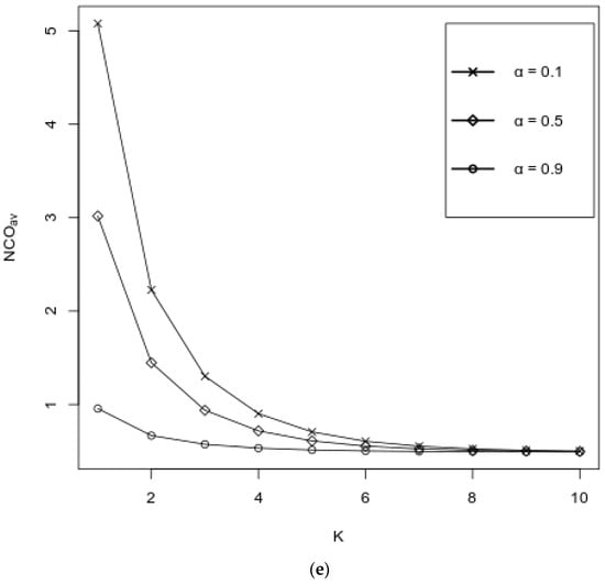 Figure 4a–e describe the behavior of performance measures as functions of K over various values of , where values of other probabilities are fixed as follows: . It is seen from Figure 4a,b that both and decrease, and their values are almost independent on ; some dependence on is observed for under small values of K, i.e., under small values of K, the performance measure is decreasing by one with respect to . As was expected, the increases with respect to K and decreases when increases (see Figure 4c). Figure 4d shows that the increases with respect to K, and its values are almost independent of . However, it is seen from Figure 4e that the values of the increase with respect to K and decrease when increases, and that the impact of the values of on the values of the is essential for a large value of K.