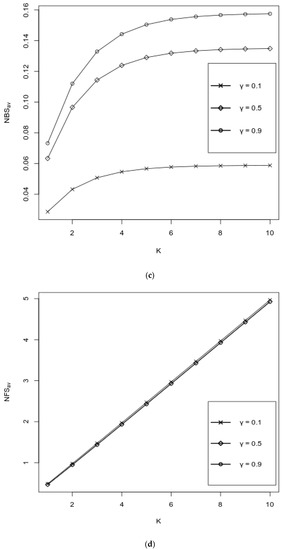 Figure 6a–e show the behavior of performance measures as functions of K over various values of , where the values of other probabilities are fixed as follows: . Plot 6(a) exhibits that is almost not affected by an increment in , and it decreases with the increasing number of servers. Conversely, plot 6(b) exhibits that, for a small value of K, is affected by an increment in , but when K ≥ 7, the impact of the values of is negligible and with increasing , increases. Note that both the and the increase with respect to K, and the values are almost independent of (see Figure 5c,d). It is seen from Figure 6e that for a small value of K, the is affected by an increment in , but when K ≥ 4, the impact of the values of is negligible and with increasing , the decreases.